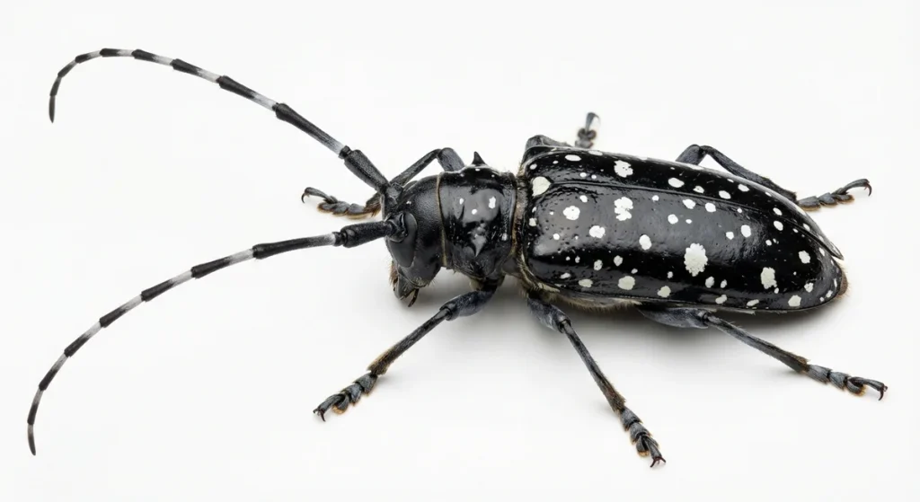 Adulte Tiere sind auffällig groß, glänzend schwarz und weiß gefleckt. In den herangezogenen Behördenquellen werden Körperlängen meist im Bereich von etwa 20 bis 36 mm genannt (CFIA: 20-35 mm; EPPO: Männchen 19-32 mm, Weibchen 22-36 mm). Typisch sind lange, schwarz-weiß gebänderte Fühler mit 11 Segmenten sowie ein meist gut sichtbarer Dorn seitlich am Thorax.