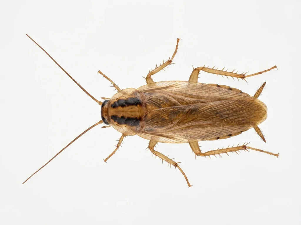 Im Wohnumfeld wird die Deutsche Schabe besonders häufig mit Waldschaben verwechselt. Für die Praxis ist das wichtigste Merkmal die Zeichnung des Halsschilds: Bei der Deutschen Schabe sind die zwei dunklen Längsstreifen typisch, während Ectobius-Arten wie die Bernstein-Waldschabe diese Streifen nicht zeigen. (Gesundheitsamt Stuttgart)