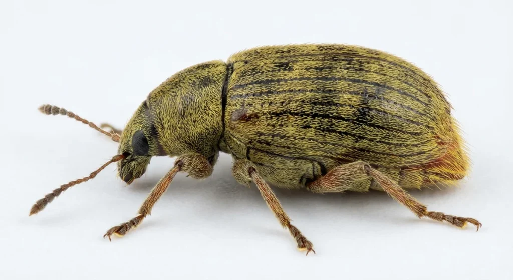 Adulte Käfer:Die adulten Käfer ernähren sich ausschließlich von Blütenpollen und verursachen keine Fraßschäden an gelagerten Produkten.